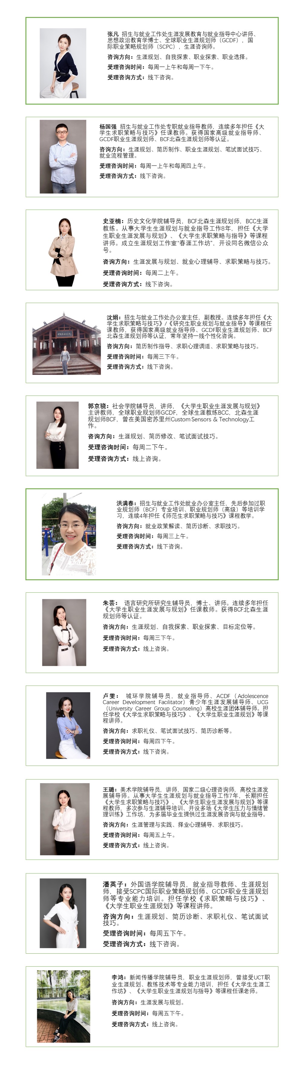 1. 本学期“一对一”生涯发展与求职就业个性化咨询服务将于9月6日(周一)正式开始,欢迎同学们预约。后续咨询相关通知更新,请留意“华大就业汇”微信公众号。