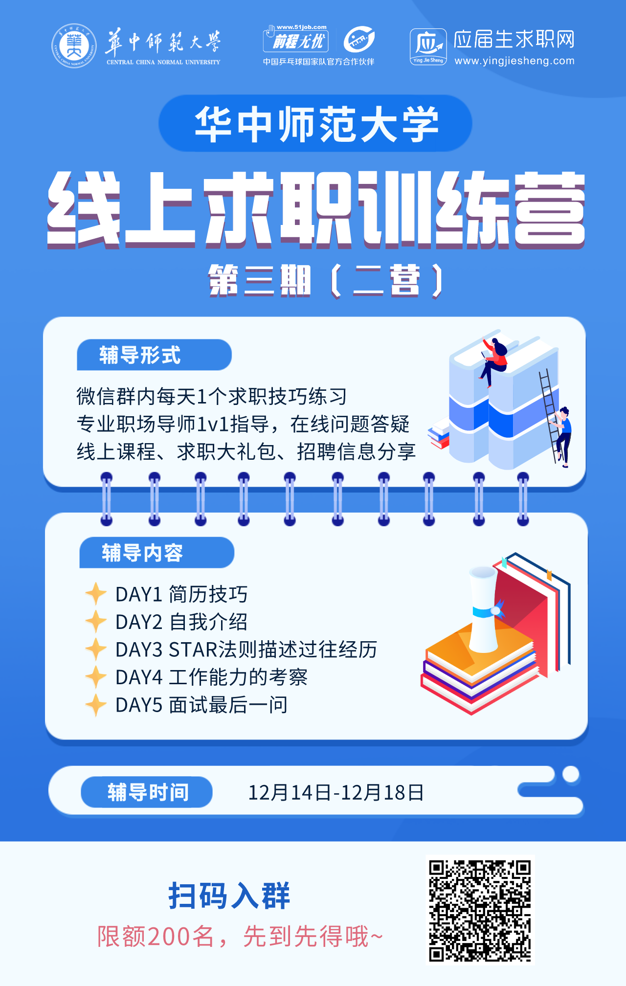 为全面贯彻落实党的十九届五中全会精神,努力实现我校毕业生更高质量更加充分就业,招生与就业工作处(以下简称“招就处”)拟举办第三期“线上求职训练营”,以帮助我校2021届毕业生在当前疫情防控常态化的大环境下更快的适应就业新氛围,掌握行业最新资讯,提升简历制作水平,掌握面试有关技巧,以达到提高同学求职技能,以积极地心态面对就业,决胜求职的目的。具体安排如下: