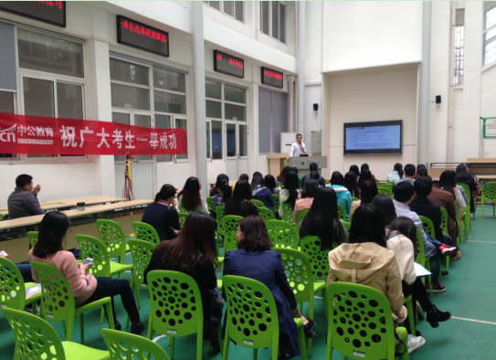活动正式开始,中公教育事业单位项目赵欣老师先从事业单位的编制制度和职业发展方向两方面向同学们全面介绍了事业单位的整体情况,对比了事业单位和公务员的考试难度与竞争格局。其次针对今年湖北事业单位改革的信息做了重点讲解,通过真题对比展示和带领同学们一起做题,让同学们切身体会到改革的变化和考试的难度。赵老师精彩幽默的解析让同学们在笑声中轻松吸取了讲座的知识。