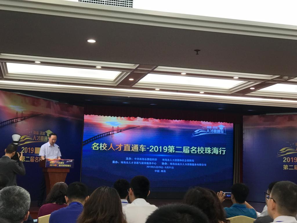 5月30日上午,珠海·名校人才直通车-2019名校珠海行活动在美丽的海滨之城珠海市开启。会议由珠海市委组织部与珠海市人力资源和社会保障局主办,珠海市人力资源与就业服务中心承办。珠海市政府副秘书长周锡川,组织部副部长、珠海市人社局局长练伟光,珠海市人社局副局长罗红、副局长王冠,珠海市人力资源与就业服务中心主任王旭,以及全国100多所高等院校,珠海市250多家重点企业参加。我校招生与就业工作处处长王茂胜等人参加会议与对接洽谈。