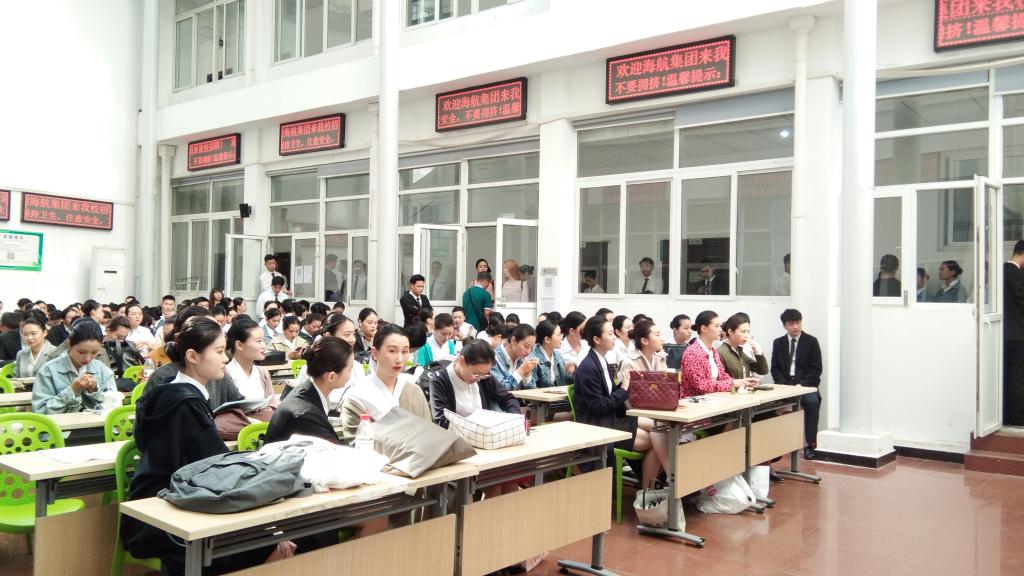 2019年4月17日上午8:30,海航集团专场招聘会在我校招生与就业工作处招聘大厅B112、B111、A101、A201进行。此次招聘会是海南航空及海航集团旗下十家航空公司乘务员联合招聘,工作地点分布在北京、天津、海口、杭州、长沙、太原、广州、深圳、三亚、西安、乌鲁木齐、大连、南宁、福州、上海、哈尔滨等城市。现场考核环节:初选→英语测试→复选→终选→心理测试→资格复核→公文呈报→体检→综合评审→政审→培训→签约。