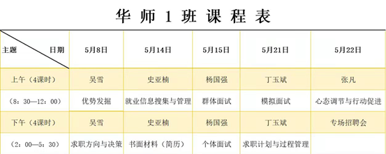 本次就业能力训练营旨在加强对学生的就业指导和就业教育,提高学员的就业能力。根据培训日程安排,共开设优势识别、求职方向与决策、就业资源获取与信息管理、书面材料、群体面试、个体面试、模拟面试、求职计划与过程管理九个课程与一场专场招聘会。