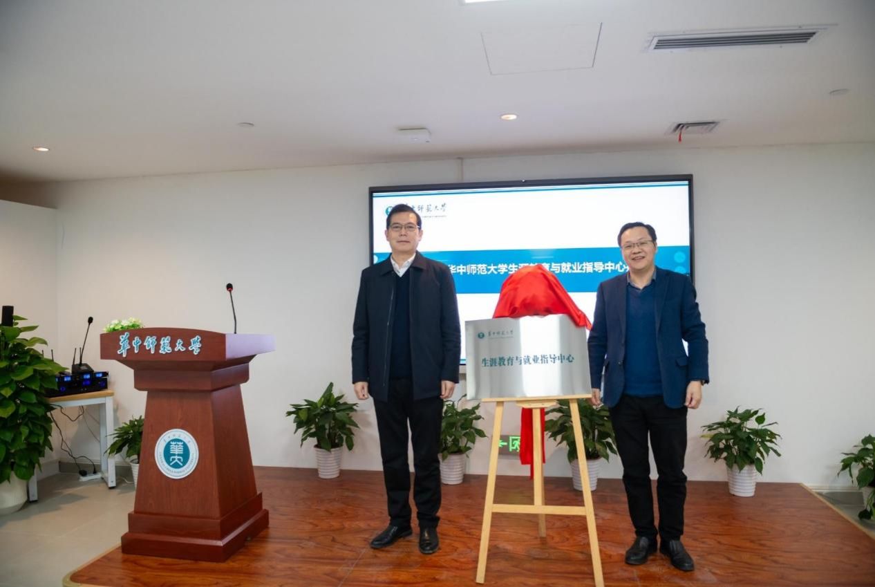 接下来,校党委副书记陈迪明、学工部副部长杨军共同为华中师范大学“生涯教育与就业指导中心”揭牌。