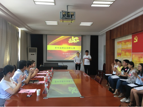 2018年5月29日下午,社会学院在院会议室举办了社院第四届研究生校园模拟招聘大赛。本次活动旨在增强学院研究生的心理素质和求职应聘技能,为研究生提供一个展示自我的舞台。担任此次模拟招聘大赛的评委有华中师范大学社会学院党委书记汪继平、就业处副处长李方红、博雅社工机构总干事王玲、社会学院研究生辅导员翟娟,社院17级部分研究生出席了本次活动。