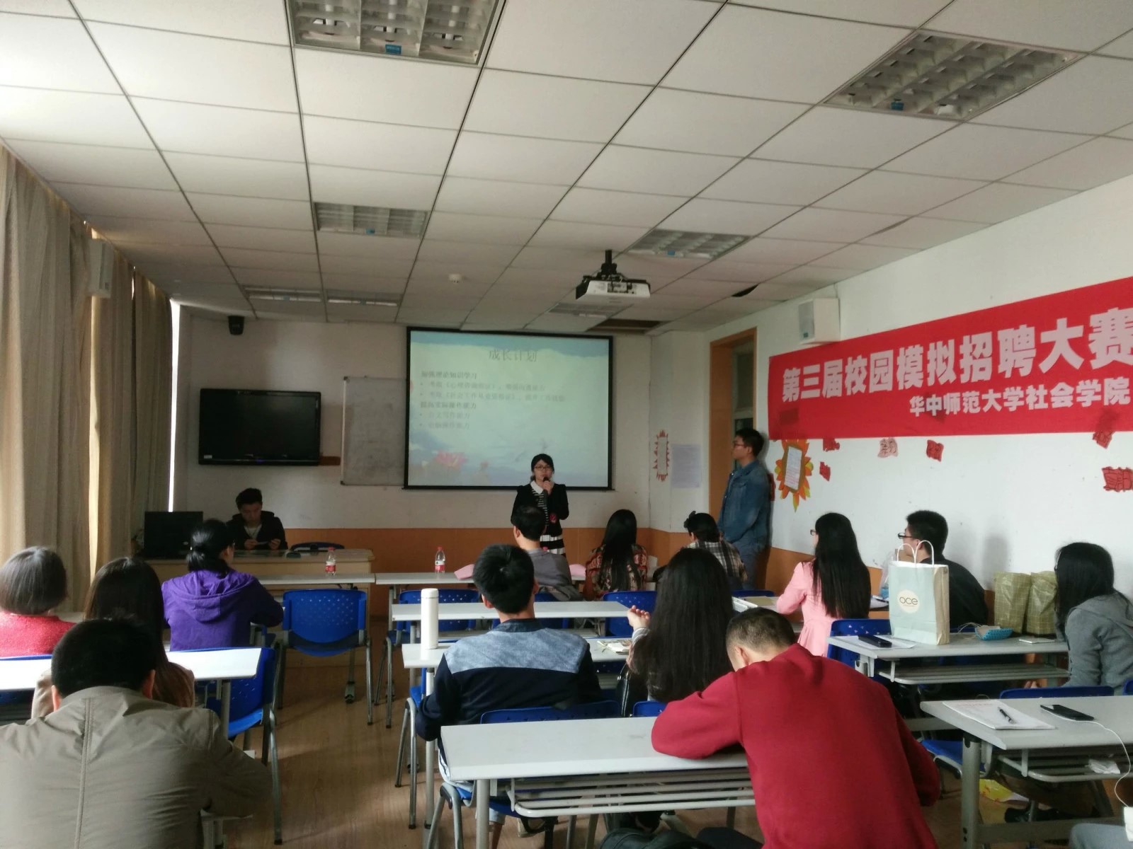 此次招聘岗位有社会工作者、人力资源专员、高校行政人员。面试开始前,选手们通过抽签决定登台顺序。下午14点30分,比赛正式准时开始。比赛共分为三个环节,首先,选手有3分钟时间自我展示,精彩的介绍加上精美的PPT展示,各个选手分别从自己的兴趣爱好、特长到求职意向以及自身优势都做了详细介绍,将自己的能力展露无遗。紧接着进行抽题答问考核选手的专业技能,随即进入提问环节,现场评委就选手所应聘的实际岗位进行提问,考核其综合实力。问题主要考验选手们对选报岗位工作内容的了解程度、工作中遇到问题的解决能力、应变能力、以及工作态度等等。面对评委们犀利的发问,选手们沉着冷静,应对自如,他们结合自己的专业以及实习经历侃侃而谈,仿佛置身于真枪实弹的招聘现场,时而妙语连珠、幽默诙谐,令人忍俊不禁,时而点子石破天惊,让人脑洞大开。或许某些竞聘者表现得不够心中所想般完美,但勇于挑战自己就难能可贵,相信他们对自我表现不会留有遗憾。