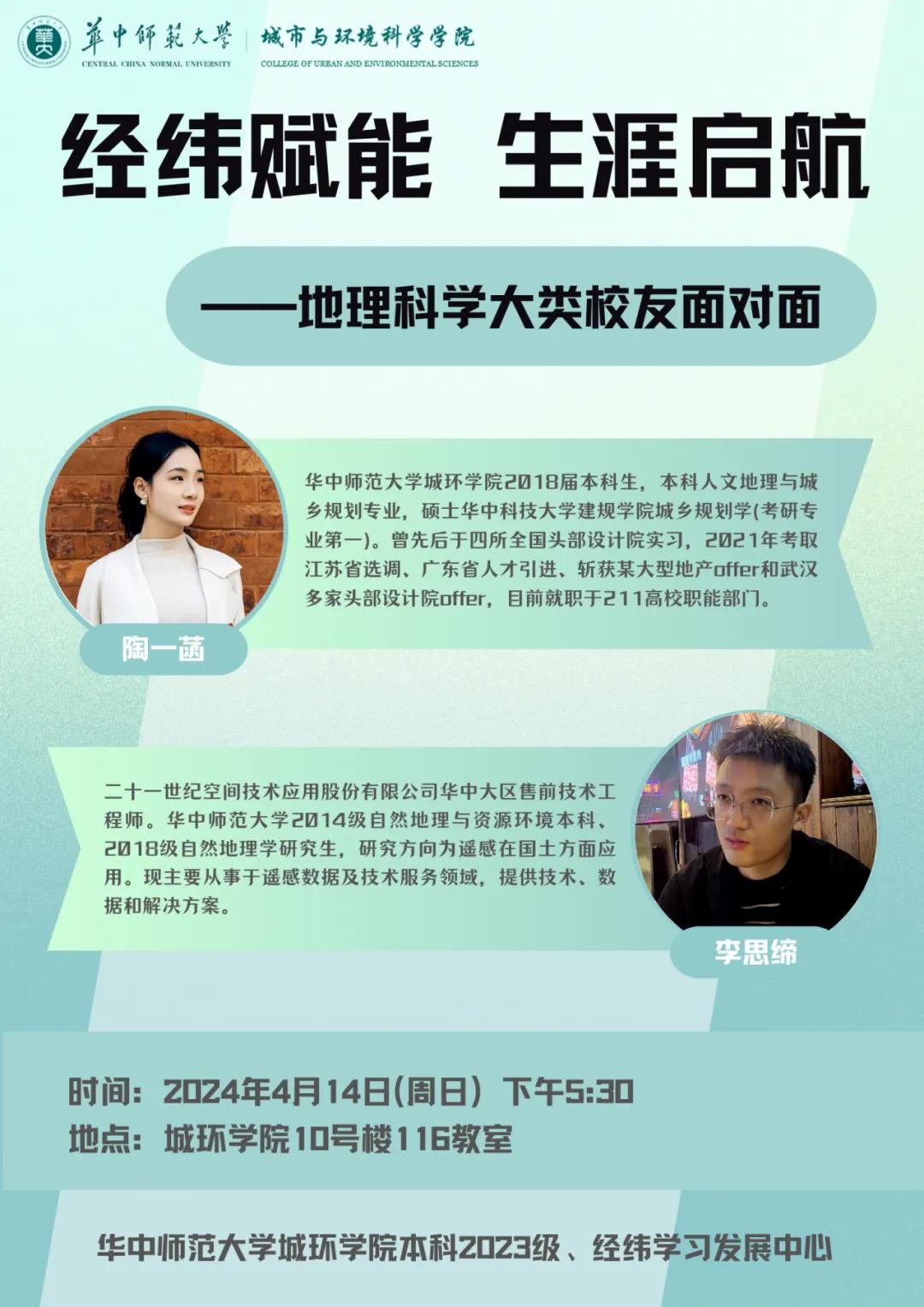 2024年4月14日下午,城环学院在10号楼南楼116教室开展地理科学大类校友面对面活动。本次活动邀请到2018届校友、二十一世纪空间技术应用股份有限公司李思缔,2018届校友、武汉理工大学陶一菡交流分享自己的成长故事,2023级全体非师范学生参加,活动由辅导员刘新星主持。
